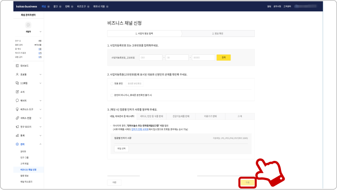 4. 사업자등록번호(고유번호) 입력 및 서류 첨부 후 [다음] 버튼을 클릭해주세요.