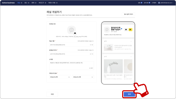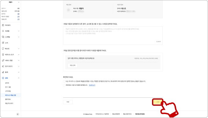 5. 입력한 정보 확인 후 [신청] 버튼을 클릭하시면 비즈니스 채널 신청이 완료됩니다.
