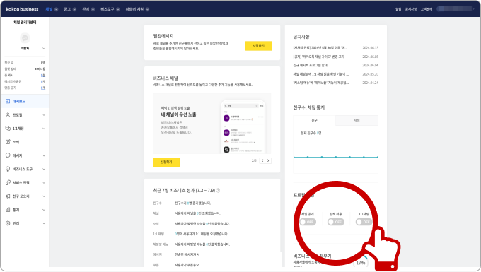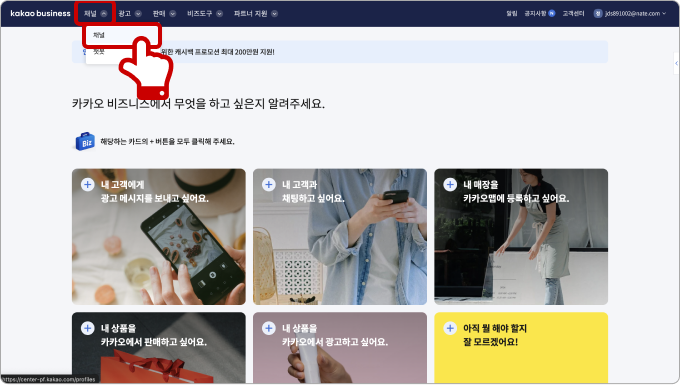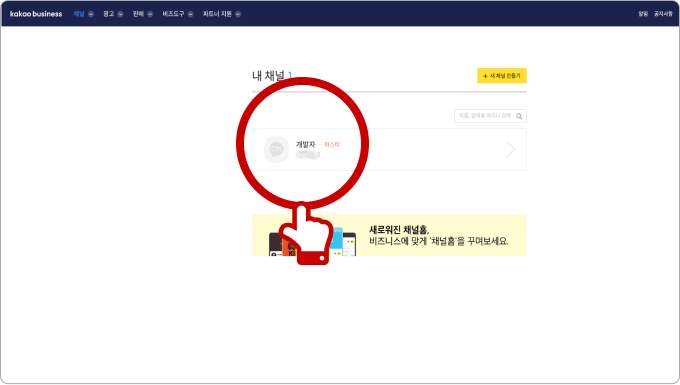 1. 카카오 비즈니스 로그인 후, 설정 변경이 필요한 채널을 선택해주세요.
