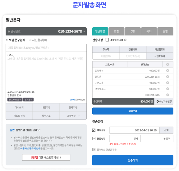 엑셀 파일을 업로드하여 대량 문자 발송이 가능하며,